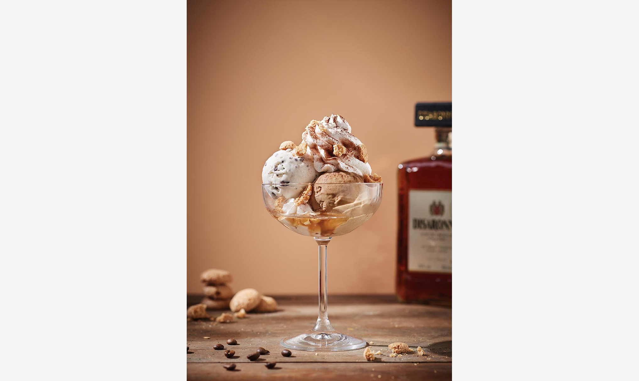 Strooi de amaretto koekjes en cacaopoeder er overheen